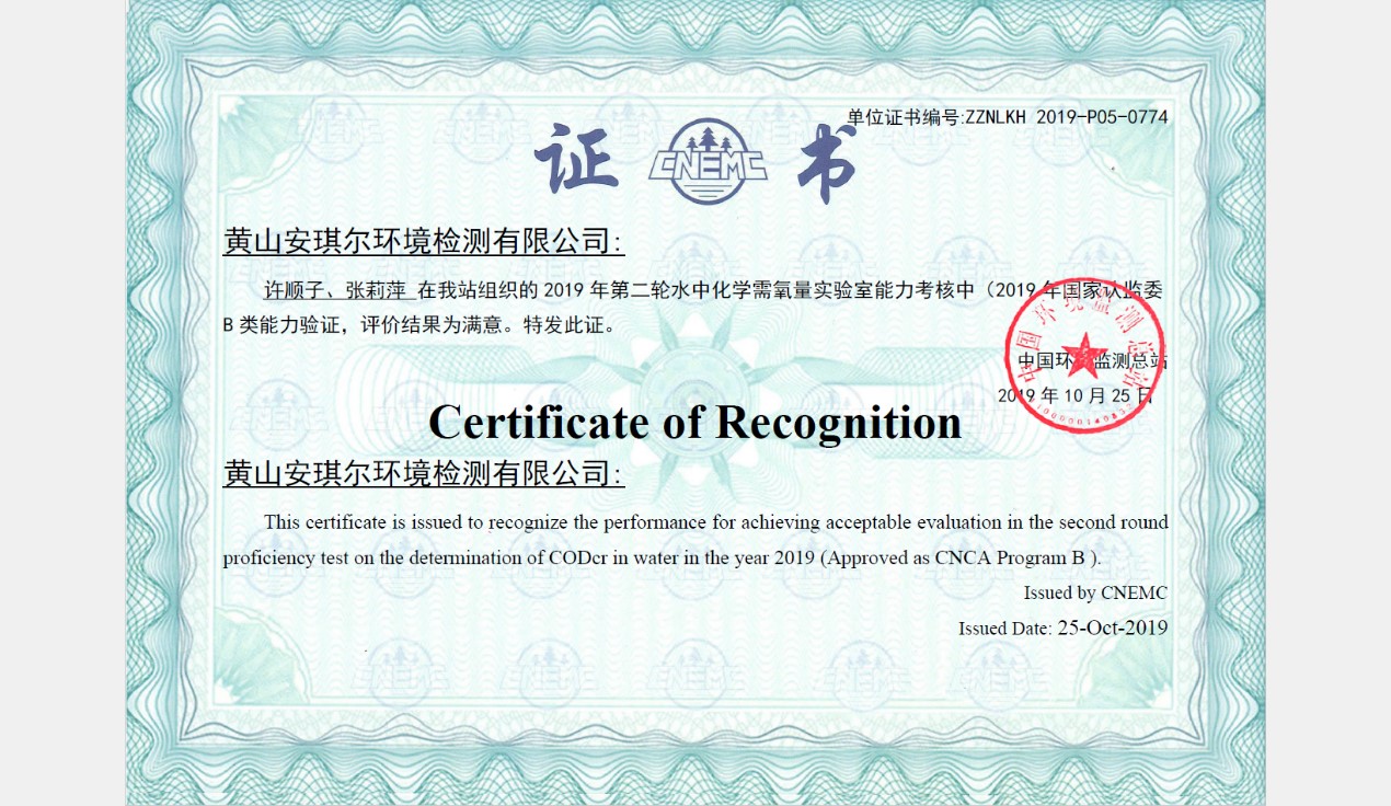 近期,我公司全資子公司黃山安琪爾環境檢測有限公司參加了2019年第二輪水中化學需氧量能力考核。本次考核由中國環境監測總站組織(列入國家認證認可監督管理委員會B類計劃),考核項目爲水中化學需氧量。爲通過考核認證,我公司按照環境監測技術規範,從實驗室的人員比對到質控标樣比對、考核樣品處理等均進行了細緻準備,并取得了滿意的考核結果。